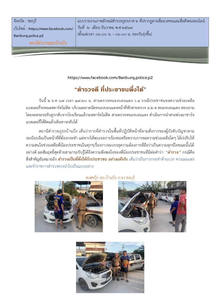 สายตรวจหนองบอนแดงให้ความช่วยเหลือประชาชนบริเวณตลาดนัด พ่วงแบตเตอรี่จนสตาร์ทรถได้ เดินทางกลับโดยปลอดภัย 2 ธันวาคม 2567 โดย admin / ข่าวประชาสัมพันธ์ วันนี้ ๒ ธ.ค ๖๗ เวลา ๑๗.๒๐ น. สายตรวจหนองบอนแดง ว.๔ กรณีประชาชนขอความช่วยเหลือแบตเตอรีรถหมดสตาร์ทไม่ติด บริเวณตลาดนัดหนองบองบอนแดงหน้าที่พักสายตรวจ ม.๒ ต.หนองบอนแดง สอบถามโดยจอดรถรอรับลูกกลับจากโรงเรียนแล้วรถสตาร์ทไม่ติด สายตรวจหนองบอนแดง ดำเนินการนำสายพ่วงมาชาร์จแบตเตอรี่ให้ติดแล้วเดินทางกลับได้ จำนวนคนดู : 38 FacebookFacebookXXLINELine