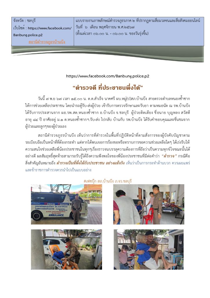 “พาผู้ป่วยถึงมือหมอ ตำรวจพร้อมดูแลถึงบ้าน” ด.ต.สำเร็จ นาคศรี ช่วยรับ-ส่งผู้ป่วยติดเตียงตามนัด รพ.บ้านบึง ได้รับคำขอบคุณจากครอบครัวด้วยความประทับใจ