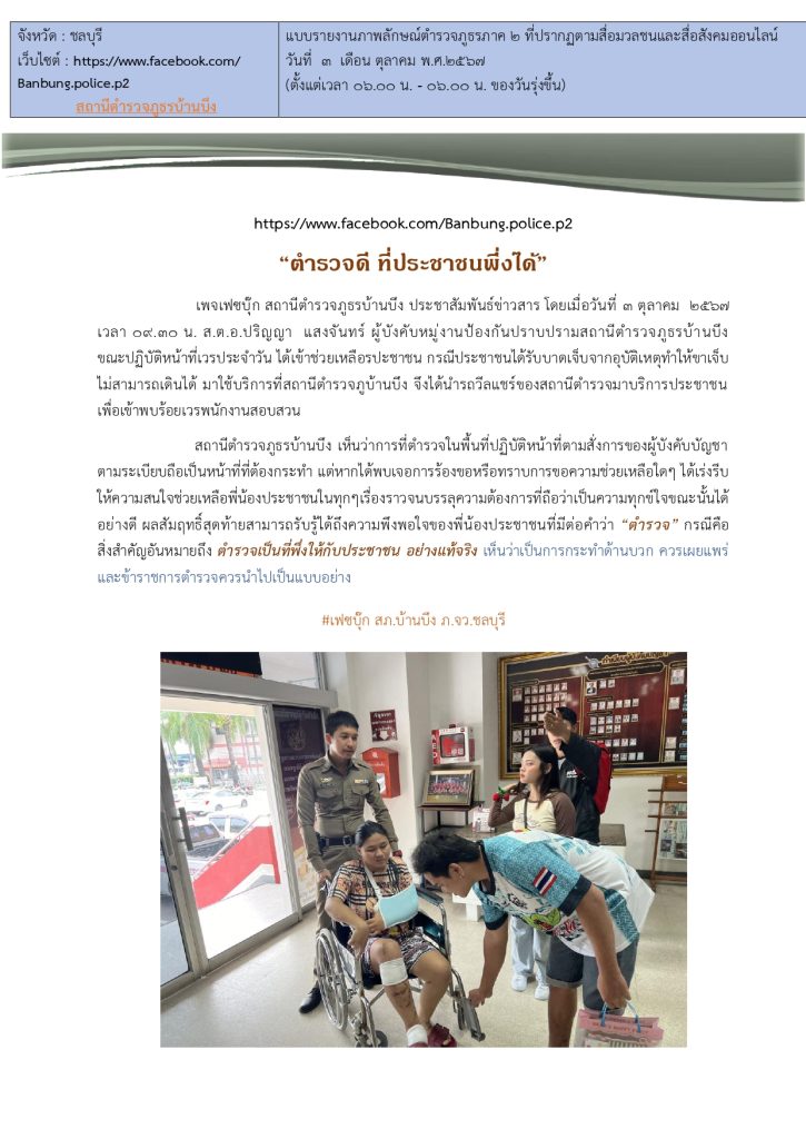 ประชาสัมพันธ์ข่าวสาร โดยเมื่อวันที่ ๓ ตุลาคม ๒๕๖๖๗ เวลา ๐๙.๓๐ น. ส.ต.อ.ปริญญา แสงจันทร์ ผู้บังคับหม่งานป้องกันปราบปรามสถานีตำรวจฎธธรบ้านบึง ขณะปฏิบัติหน้าที่เวรประจำวัน ได้เข้าช่วยเหลือรปะชาชน กรณีประชาชนได้รับบาดเจ็บจากอุบัติเหตุทำให้ชาเจ็บ ไม่สามารถเดินได้ มาใช้บริการที่สถานีตำรวจฎบ้านบึง จึงได้นำรถวีลแชร์ของสถานีตำรวจมาบริการประชาชน เพื่อเข้าพบร้อยเวรพนักงานสอบสวน